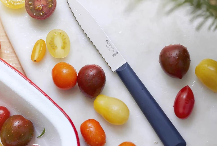 Le couteau cranté N°313 de la collection Essentiels + permet de trancher et découper de nombreux aliments. Il possède une lame dentée de 10 cm et un manche en plastique recyclé rPP bleu, qui permet de le passer au lave-vaisselle.